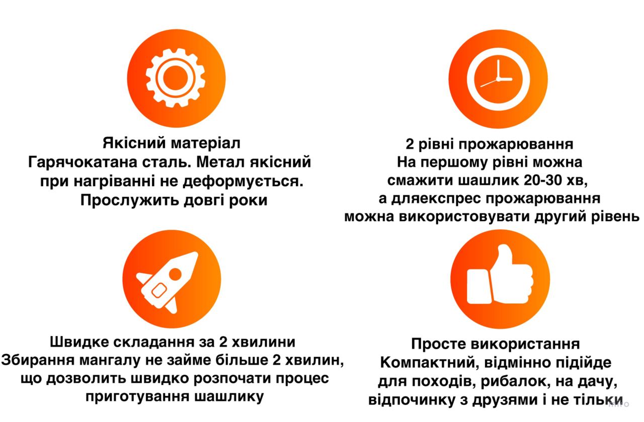 Мангал розкладається всього за 2 хвилини, Вся конструкція дуже проста і надійна. Гарантія на мангал 5 роки.